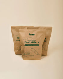 Il Kit Casa Susy® include tutto l’essenziale: fieniera pratica ed elegante, eco lettiera biodegradabile e vaschetta in alluminio riciclabile. Prodotti funzionali, resistenti, realizzati con materiali naturali e pensati per integrarsi in casa con stile.