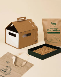 Il Kit Viaggio Susy® è pensato per semplificare tutto: vaschetta leggera e riutilizzabile, eco lettiera in formato pratico, fieniera compatta, il tutto racchiuso in una borsa in lino fatta a mano. Una soluzione bella, sostenibile e funzionale per spostarsi con il proprio coniglio in totale serenità.
