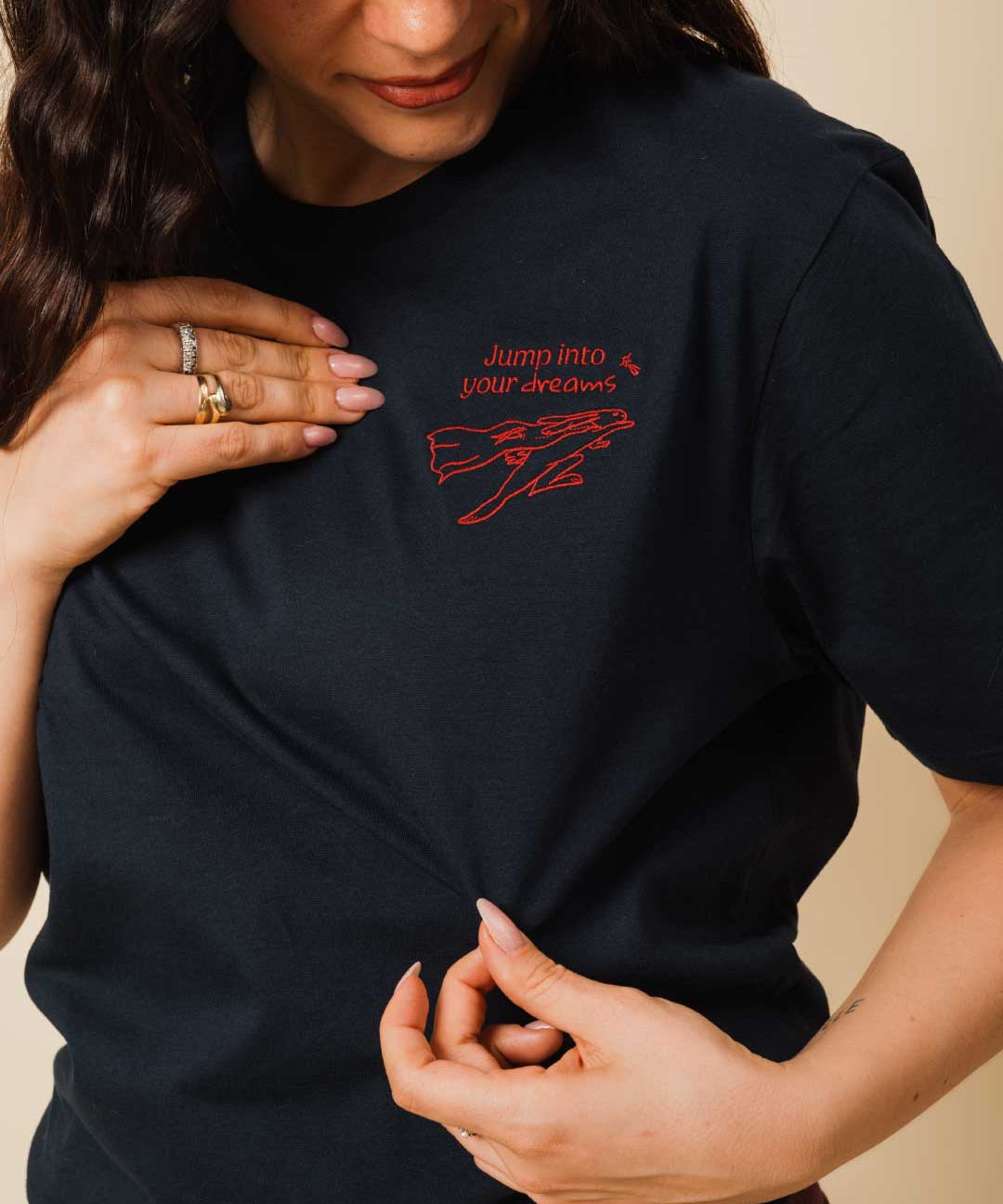 Ricamo esclusivo Susy® sul petto, illustrato da Gaia Petra Sana