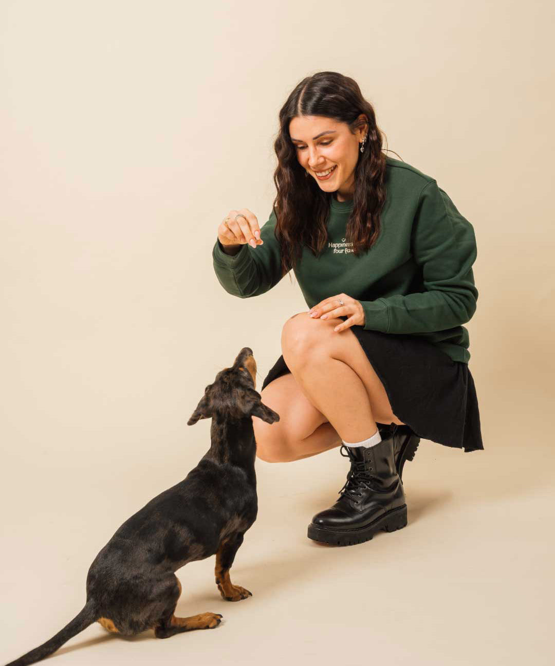 Embroidery: contrasting front with “Happiness has four paws” lettering