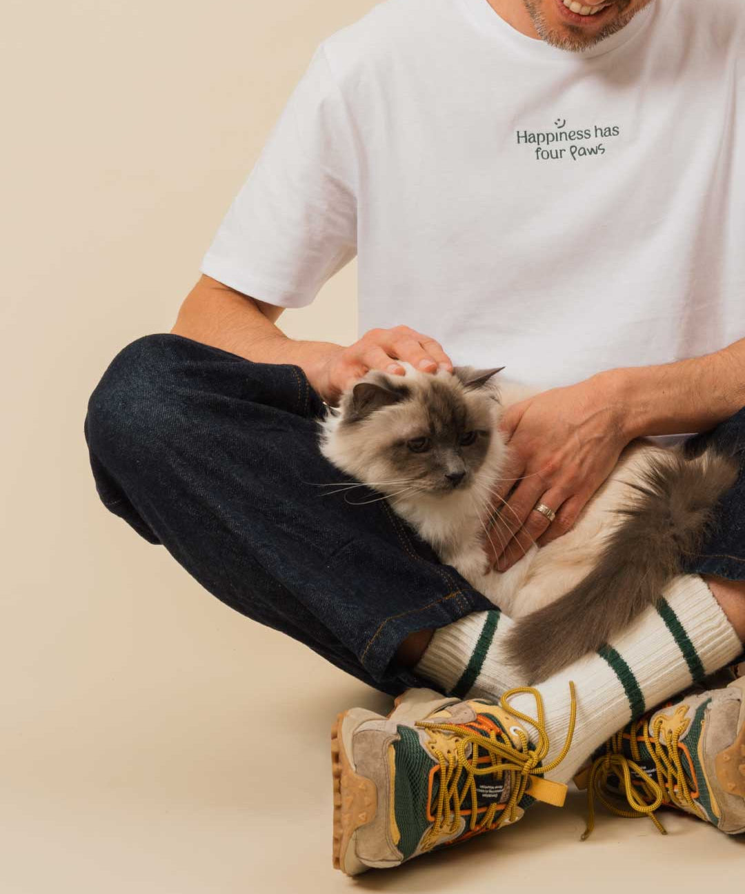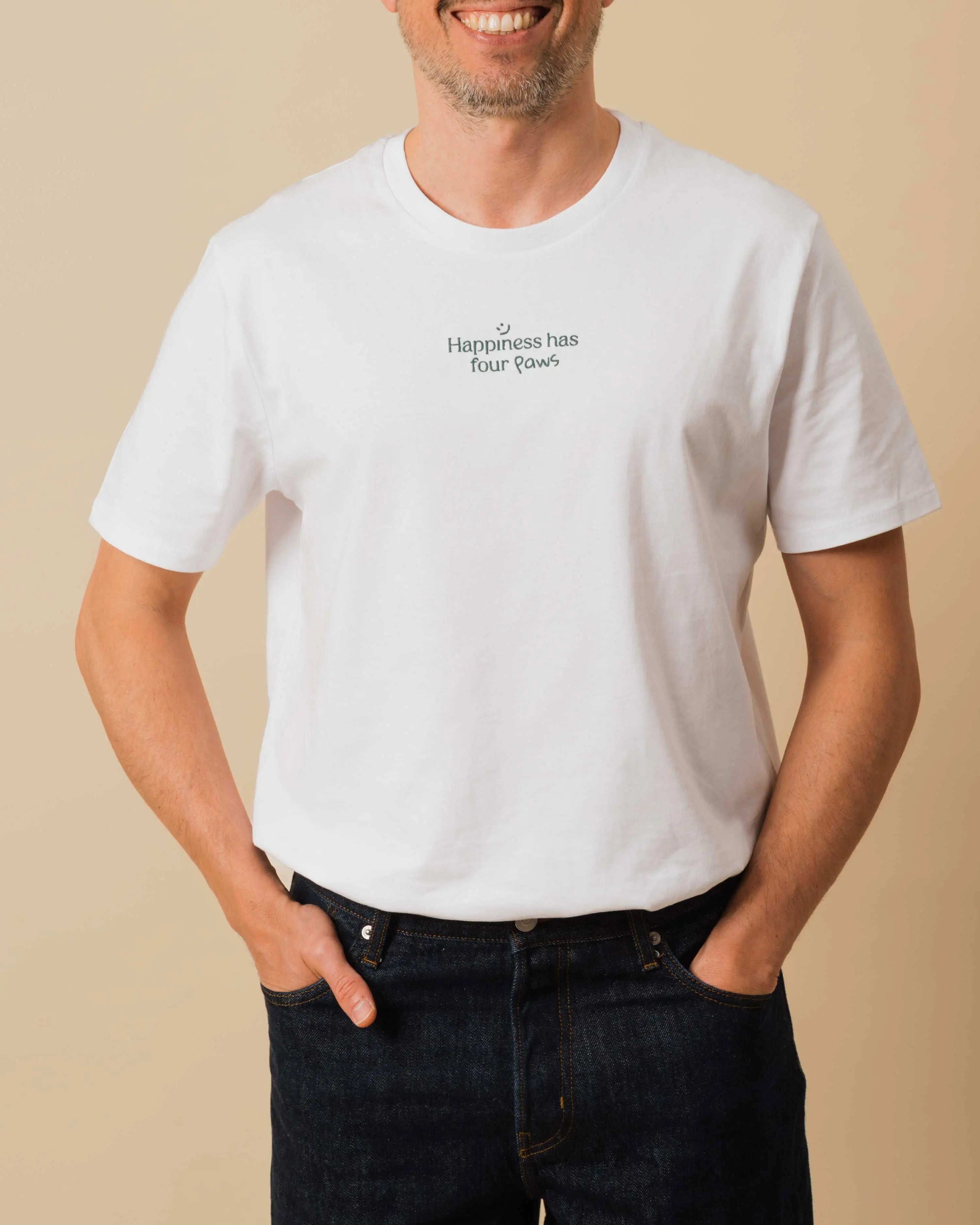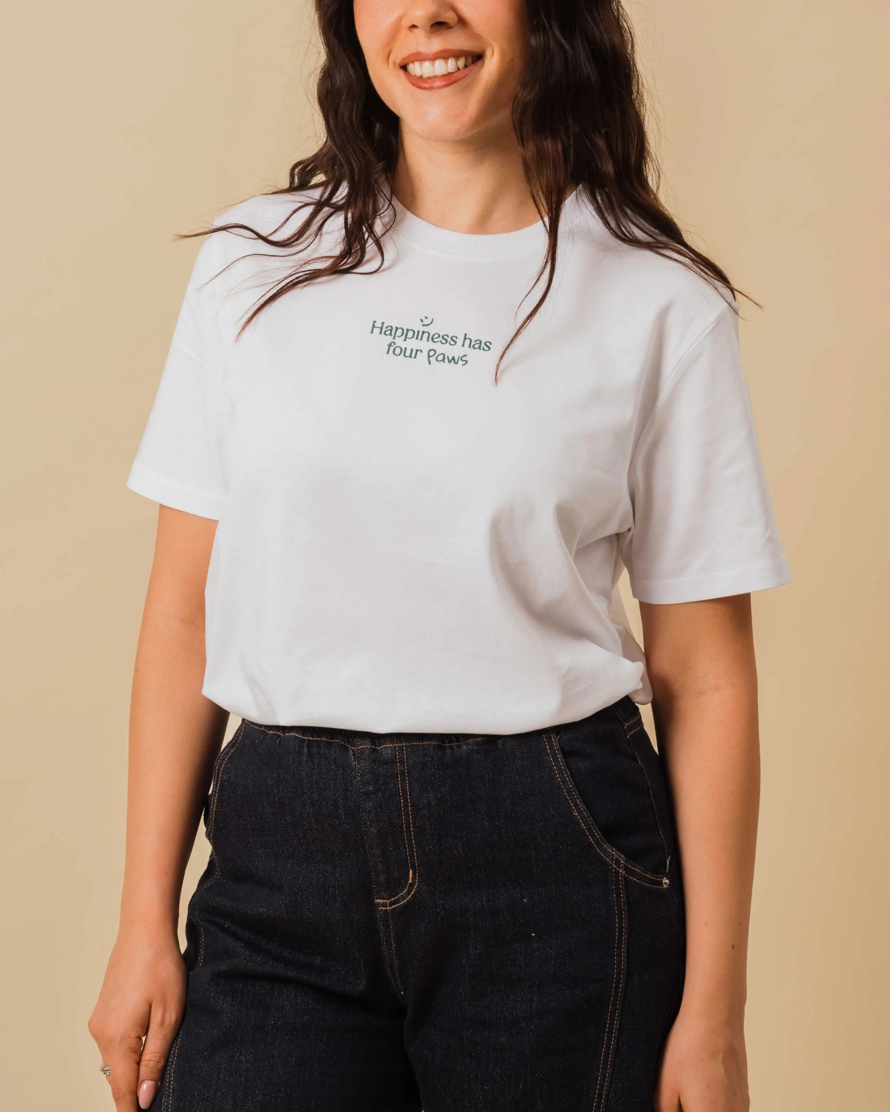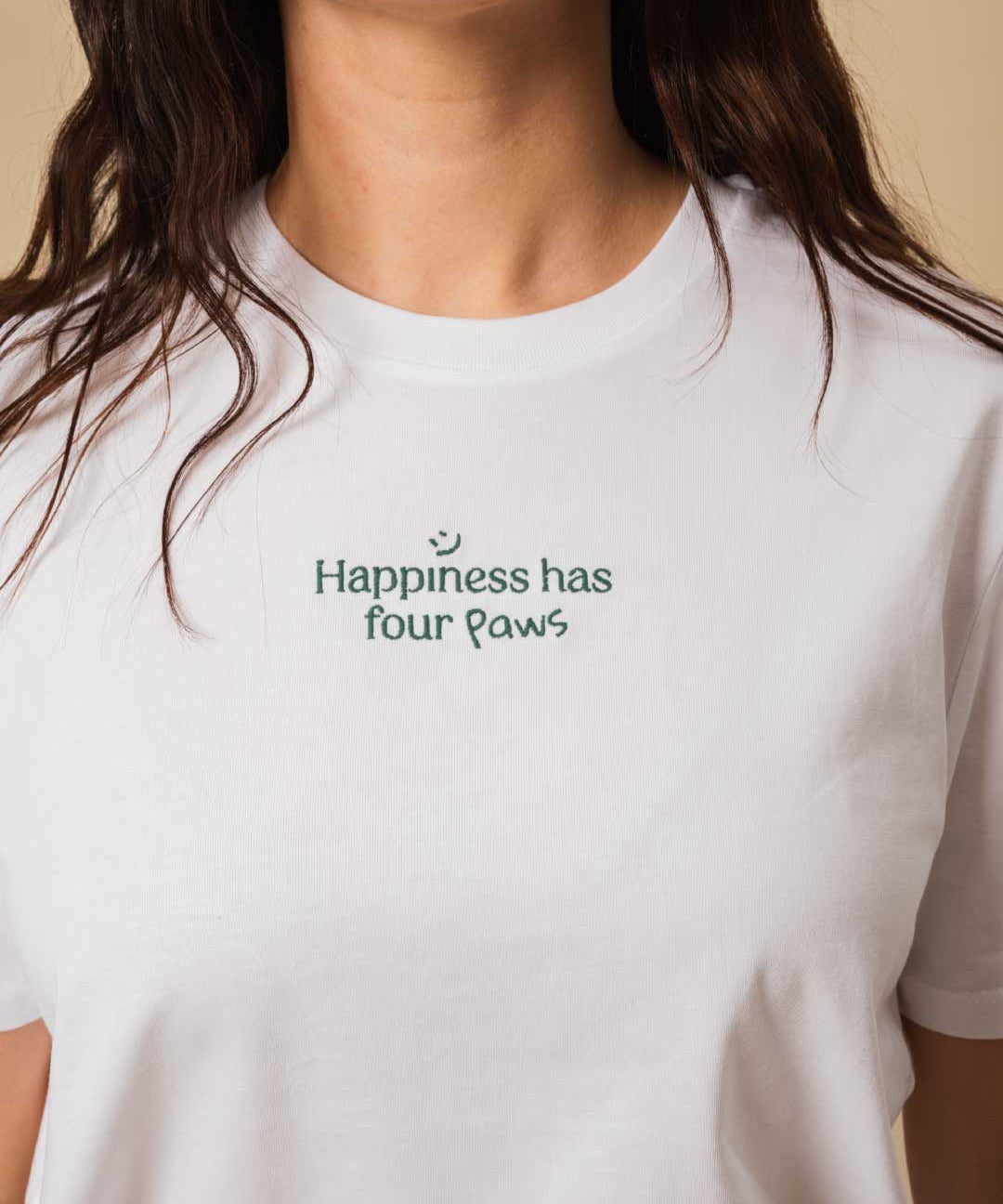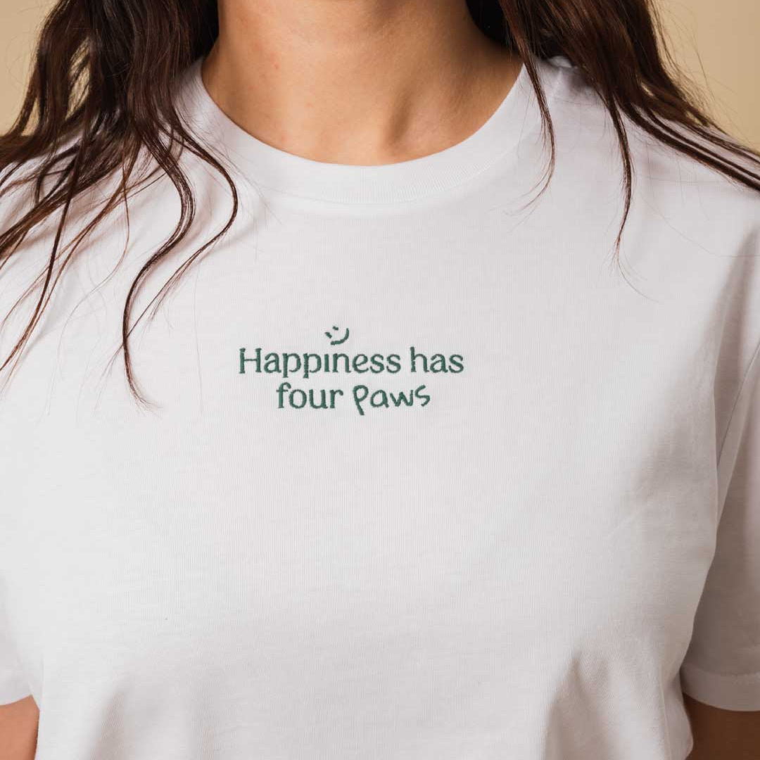 At the center of the chest, the embroidery “Happiness has four paws” is the heart of the message: simple, essential, true.