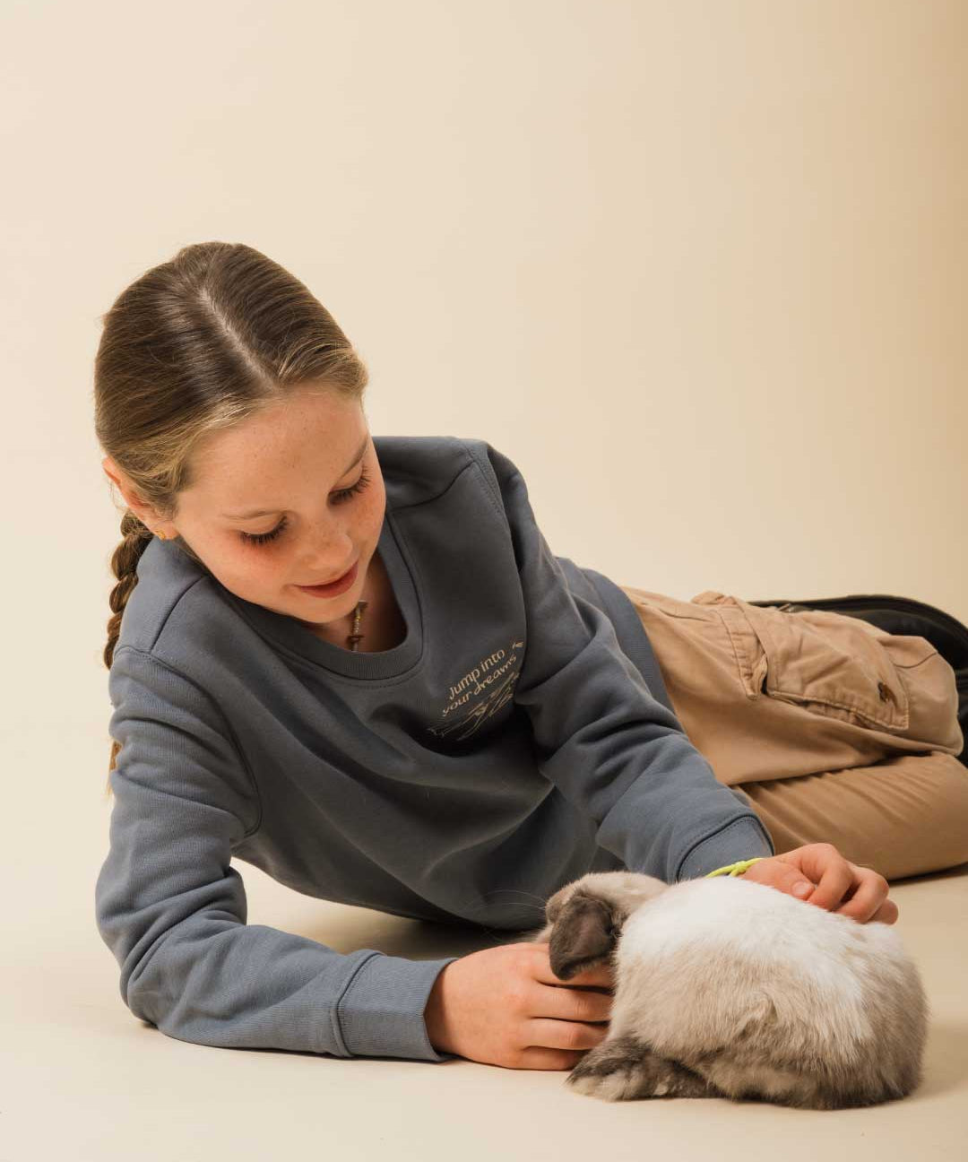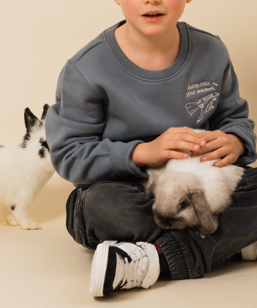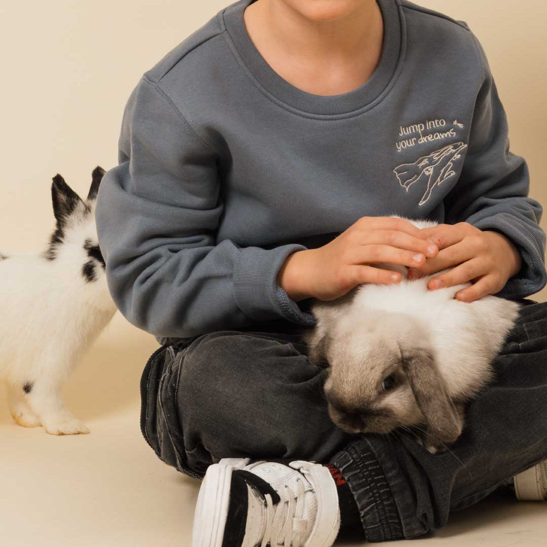 On the chest, the protagonist is a flying bunny with a cape, embroidered with care and attention. A little hero who invites children and teenagers to believe in their dreams and jump high to chase them. The mineral gray color is modern and versatile, perfect for any occasion. The contrasting beige embroidery stands out delicately, adding a bold but balanced touch.
