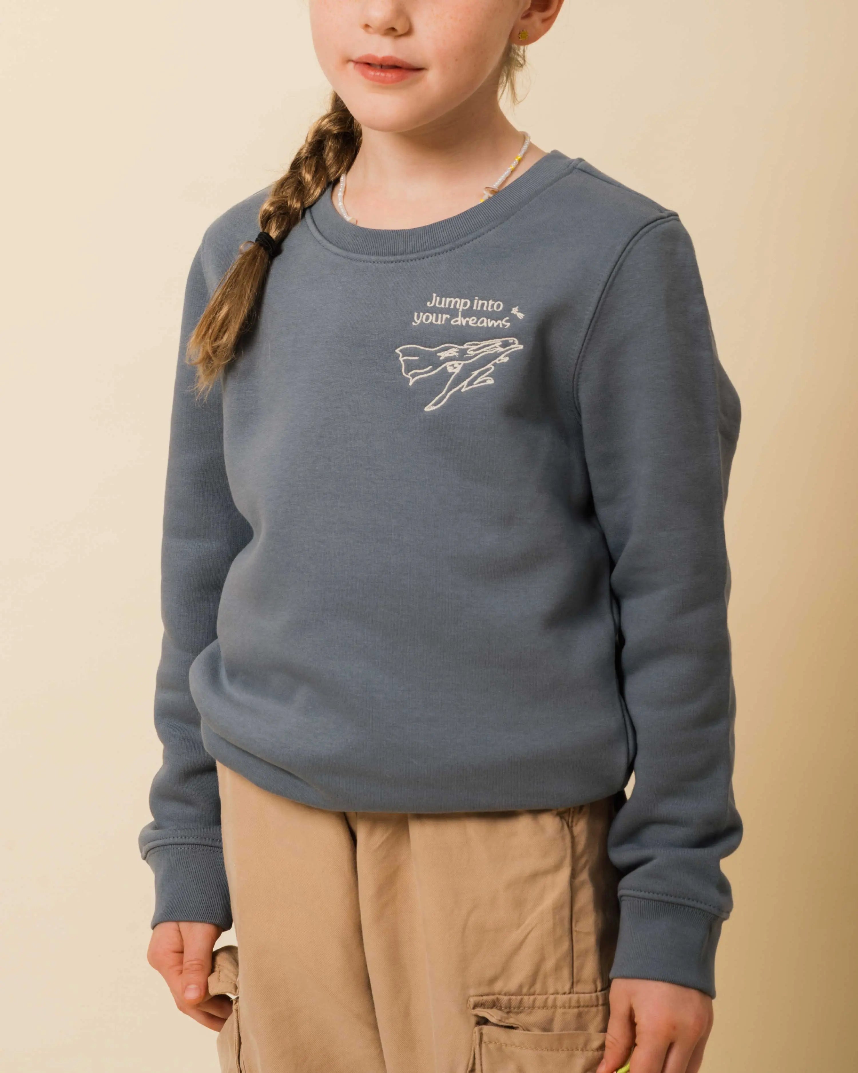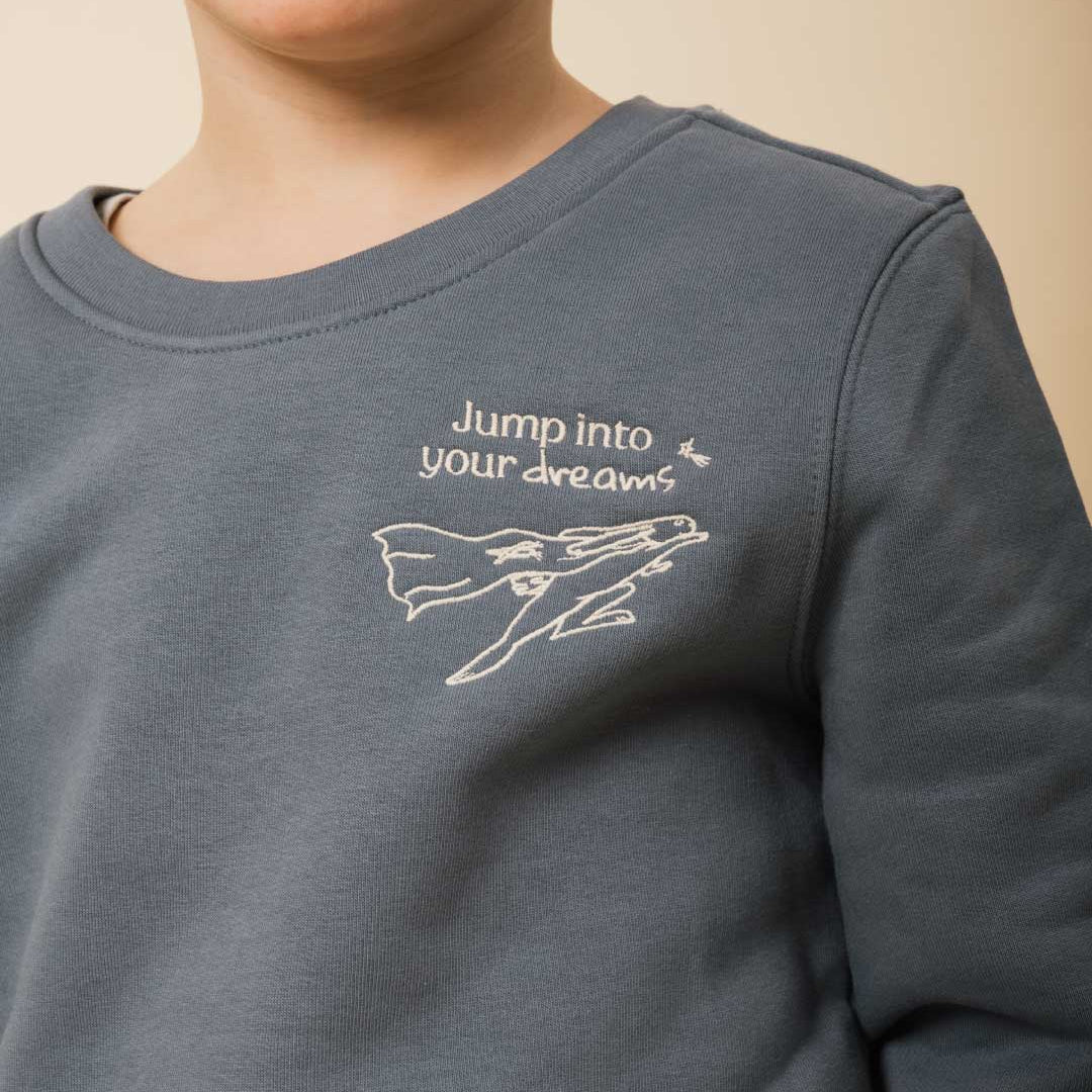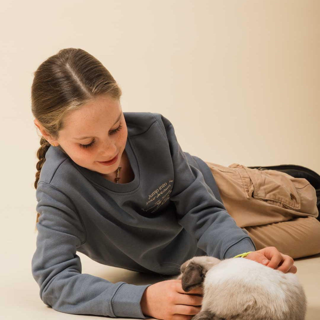On the chest, the protagonist is a flying bunny with a cape, embroidered with care and attention. A little hero who invites children and teenagers to believe in their dreams and jump high to chase them. The mineral gray color is modern and versatile, perfect for any occasion. The contrasting beige embroidery stands out delicately, adding a bold but balanced touch.
